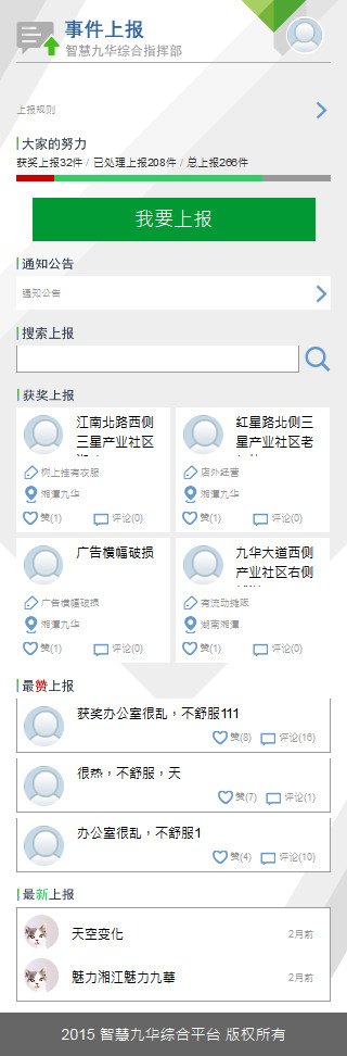 事件上報前臺主要功能有:提交上報、搜索上報、查看獲獎上報、查看最贊上報、查看最新上報等操作。提交上報操作前須關(guān)注“九華人”微信公眾號,并進(jìn)行帳號注冊后才可進(jìn)行操作。