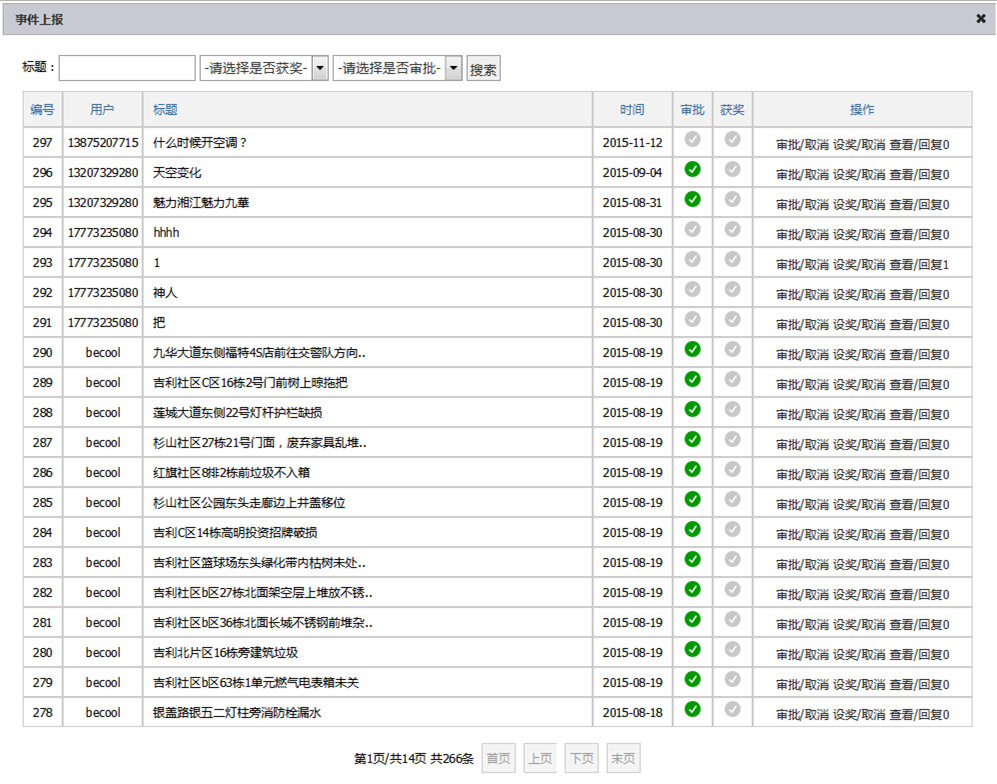 事件上報后臺主要功能有:收集所有上報數據,并進(jìn)行查看上報、回復上報、上報審核、上報設獎等操作。