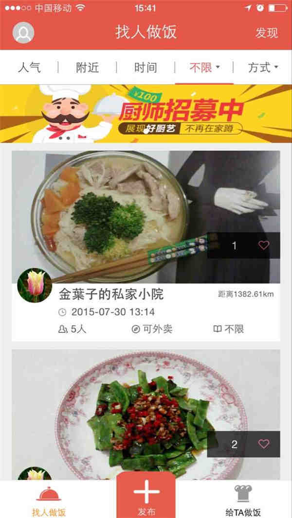 在家吃:由深圳在家文化傳播有限公司策劃的一種集家廚、社交、賺錢(qián)為一體的生活類(lèi)APP,旨在為人們提供一個(gè)更為方便舒心的“吃飯”平臺,享受獨特的美味生活。是一款集家廚、社交、收益為一體的生活服務(wù)類(lèi)手機應用軟件,主要面向兩個(gè)群體:擁有好廚藝卻賦閑在家的社區阿姨或大叔以及身處異鄉想吃家鄉菜又不想自己做飯的上班族。阿姨或大叔可通過(guò)手機客戶(hù)端發(fā)布自己的拿手菜以展示廚藝,賺取外快,吃貨可線(xiàn)上選擇做飯方式并預約廚師做飯。