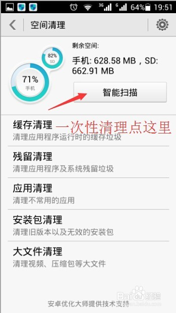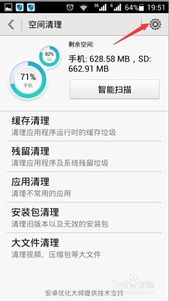 2. 點(diǎn)擊以后,出現了幾項不同的功能,有空間清理、手機加速等等,我們點(diǎn)擊“空間清理”,如圖所示。