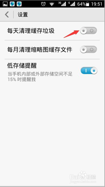 6.在“每天清理緩存垃圾”項目的右側默認是關(guān)閉的,我們需要將右側的條框向右拉,變成打開(kāi)狀態(tài),這樣,我們的設置就完成了。