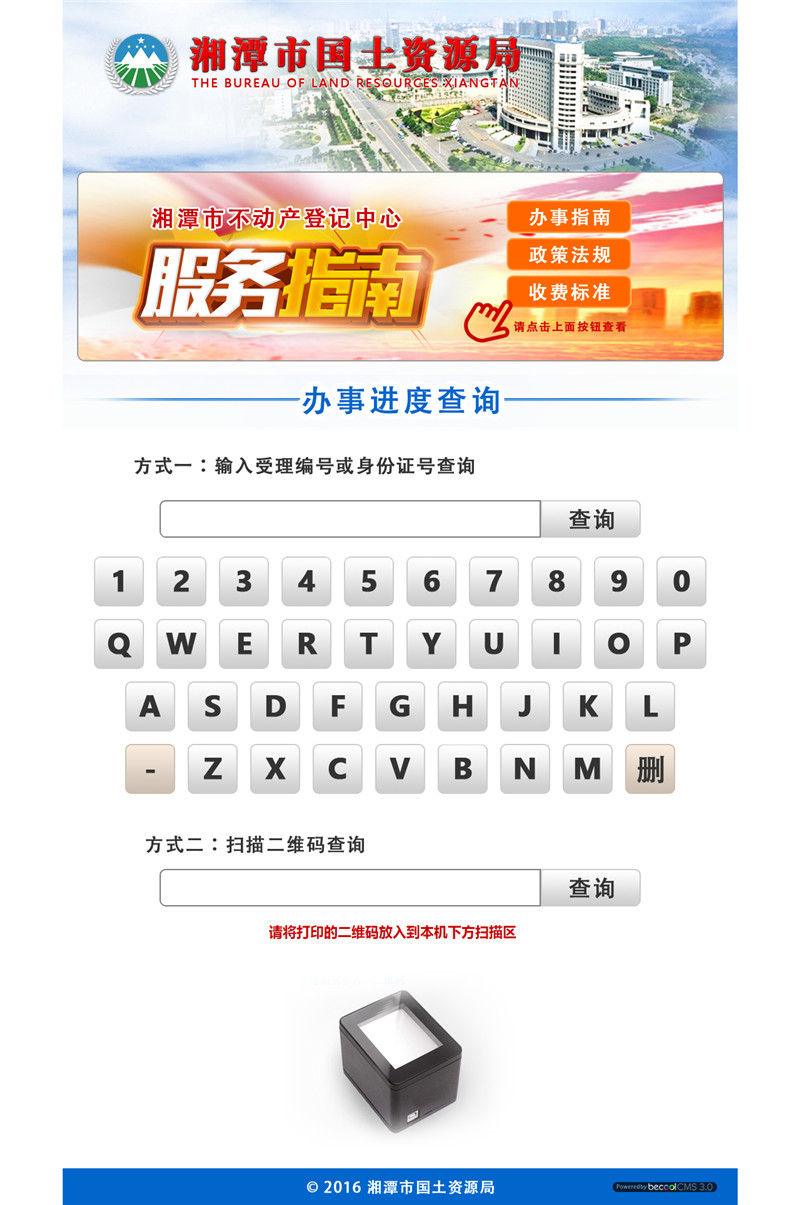 本項目為湘潭市國土資源局辦事大廳,用于群眾查詢(xún)辦事進(jìn)度的觸屏機上。項目含政策法規資訊和辦事進(jìn)度查詢(xún)兩塊,群眾只需在觸屏界面上輸入受理編號或身份證號,即能查詢(xún)到辦事的進(jìn)度。此項目分管或下級局屬單位可軟硬件直接成套購買(mǎi)后使用。