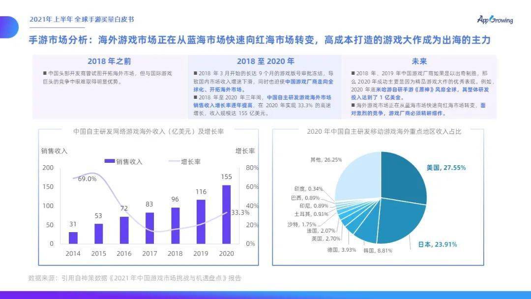 神策數據在《2021 年中國游戲市場(chǎng)挑戰與機遇盤(pán)點(diǎn)》報告中指出:2016年以來(lái),移動(dòng)游戲成為游戲市場(chǎng)增長(cháng)的絕對主力,且手游出海潛力被發(fā)掘,越來(lái)越多的高成本大作開(kāi)始從海外市場(chǎng)“吸金”。