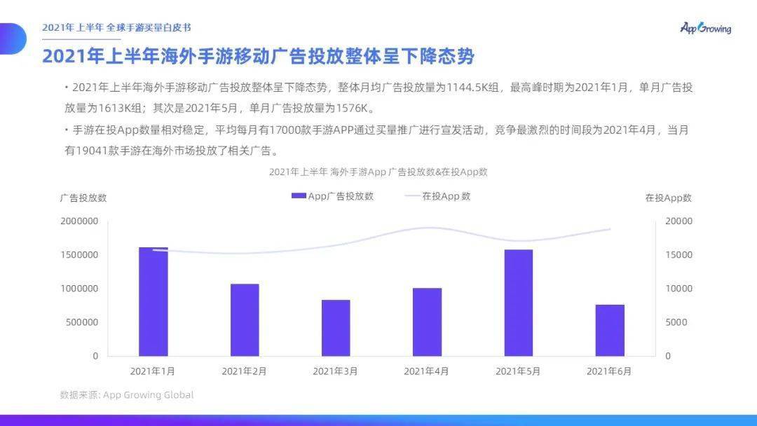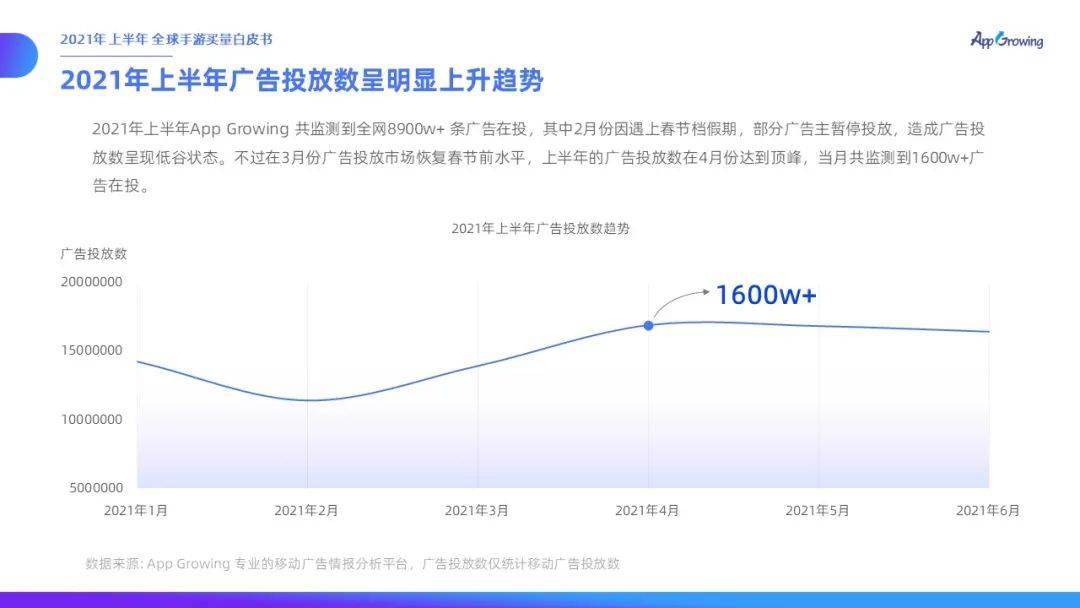 整體來(lái)看,2021年上半年手游廣告數呈現上升趨勢,且在6月份達到投放峰值。