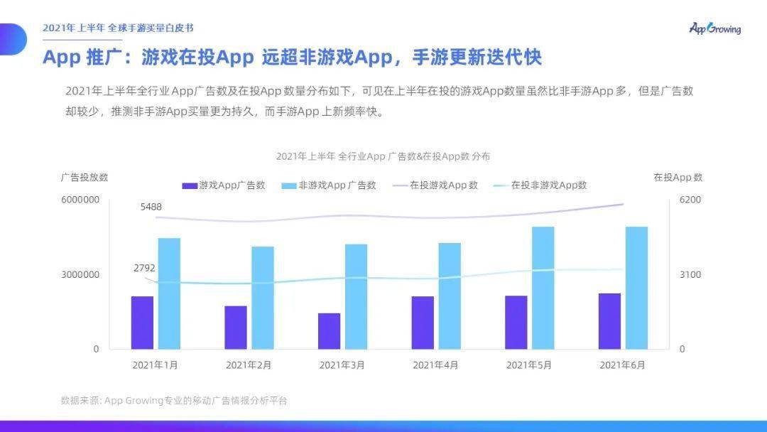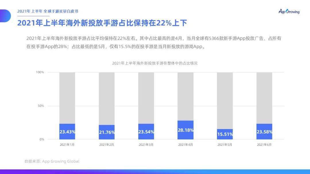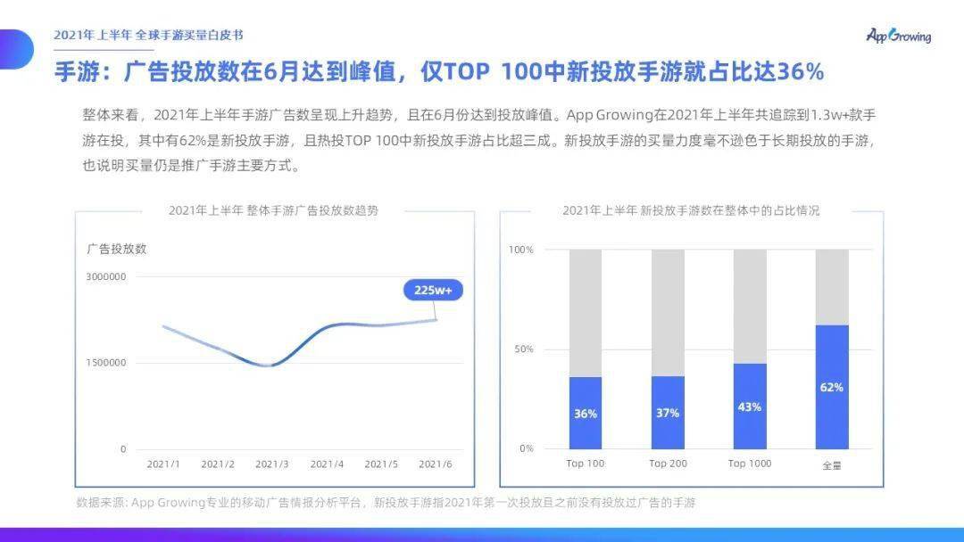 App Growing 在2021年上半年共追蹤到1.3w+款手游在投,其中有62%是新投放手游,且熱投TOP100中新投放手游占比超三成。新投放手游的買(mǎi)量力度毫不遜色于長(cháng)期投放的手游。
