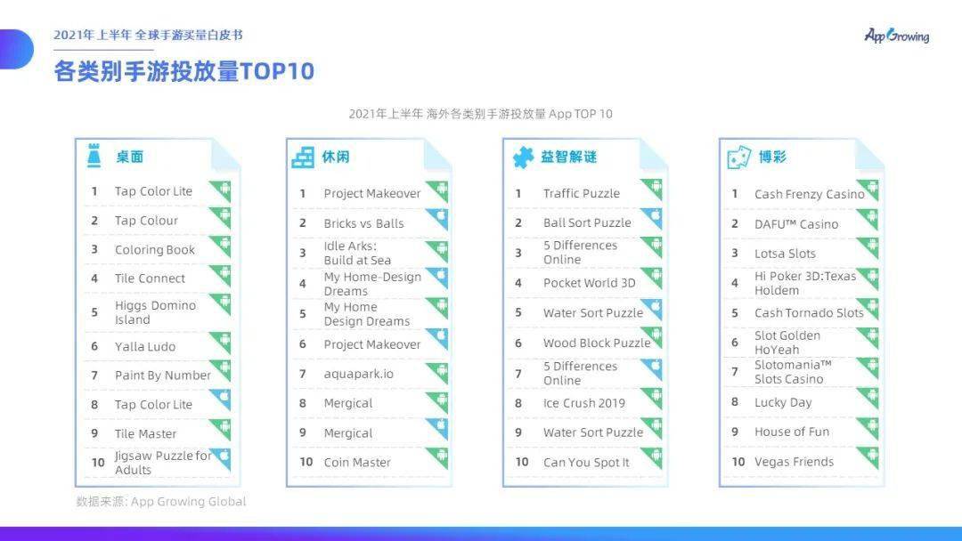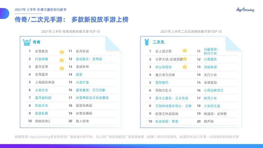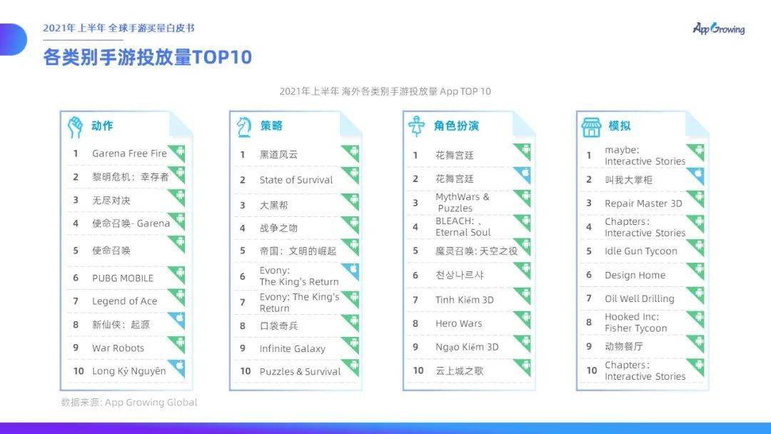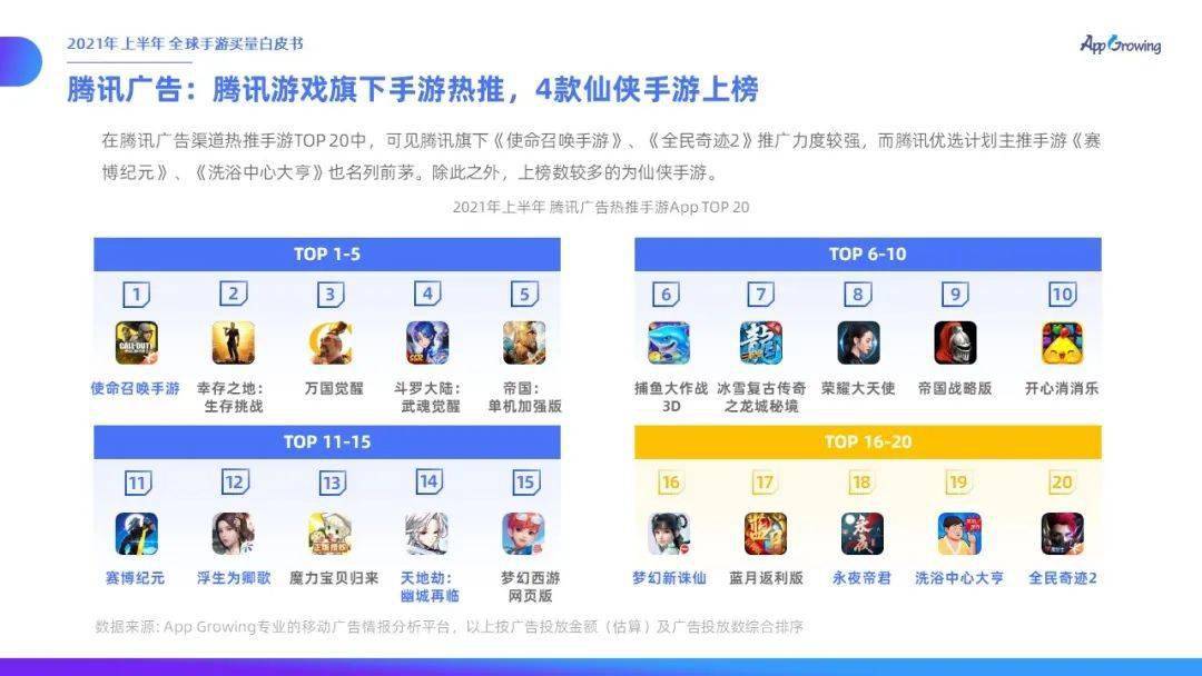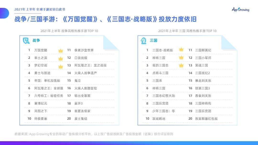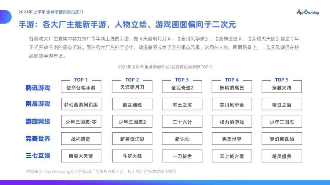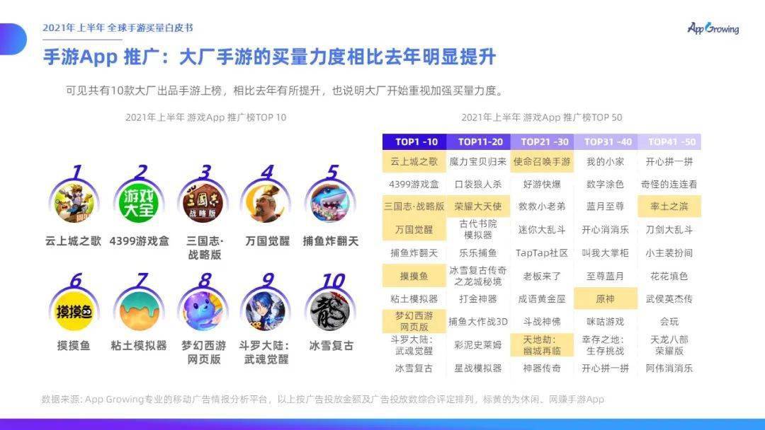 在手游App 推廣方面,可見(jiàn)2021年上半年整體熱投手游榜TOP 50中有10款大廠(chǎng)手游上榜。