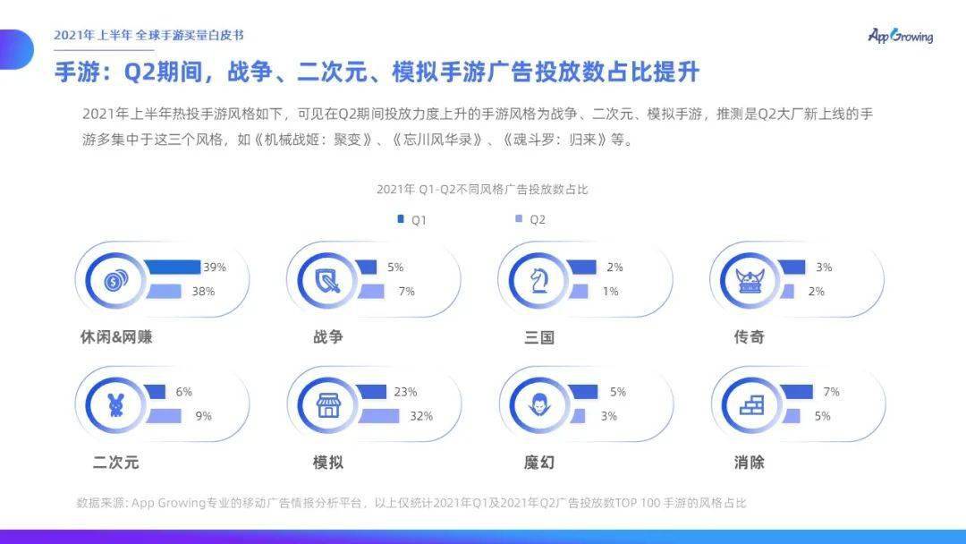 統計2021年上半年的重點(diǎn)手游風(fēng)格,可以發(fā)現休閑&網(wǎng)賺、戰爭、三國是今年上半年投放力度最強的三大重點(diǎn)手游風(fēng)格,而同比Q1時(shí),戰爭、二次元、模擬在Q2投放力度提升。