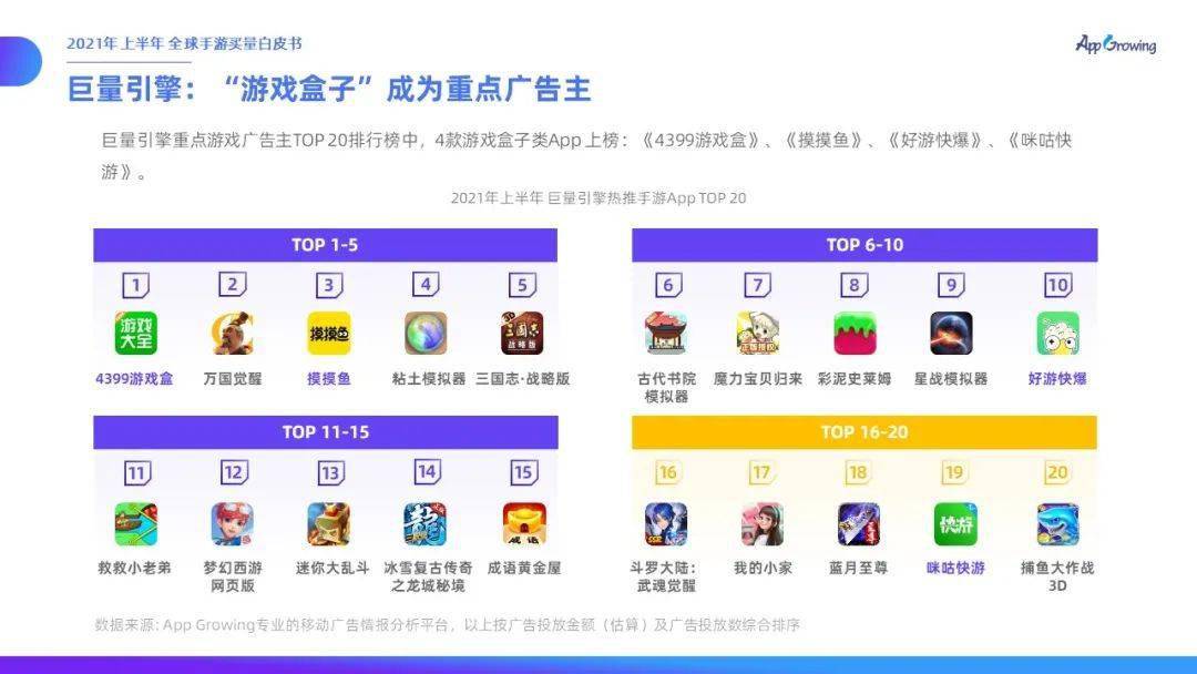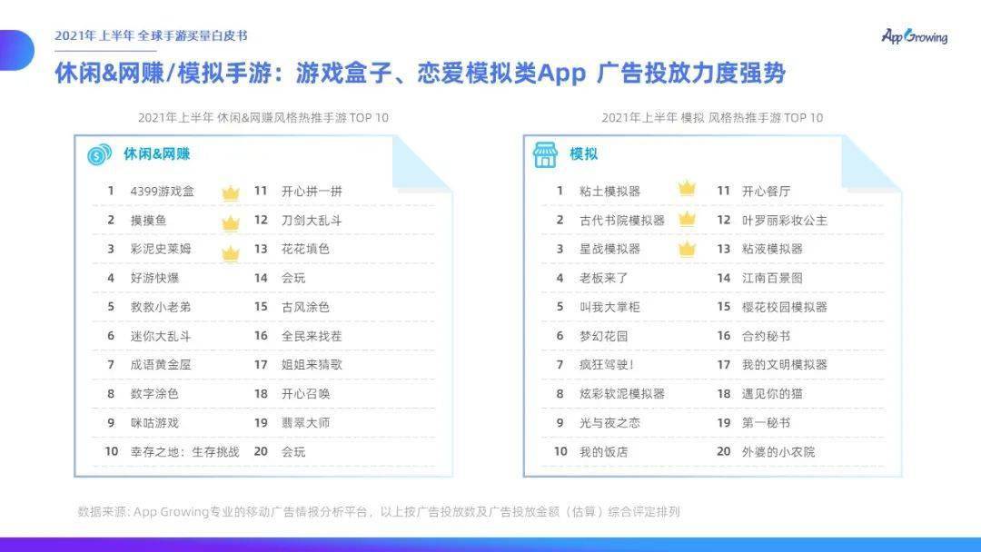 具體到每個(gè)重點(diǎn)風(fēng)格下的熱推手游,《4399游戲盒》成為 2021年上半年休閑&網(wǎng)賺手游熱推App TOP 1,也可以發(fā)現類(lèi)似的“游戲盒子”平臺在今年上半年的廣告投放力度也比較大,比如《摸摸魚(yú)》、《好游快爆》、《咪咕游戲》。