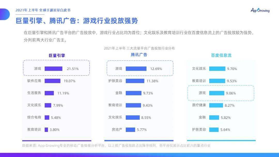 從三大平臺的行業(yè)投放分布情況來(lái)看,游戲行業(yè)是巨量引擎、騰訊廣告的重點(diǎn)廣告主,其中在巨量引擎中游戲行業(yè)廣告投放占比超20%。