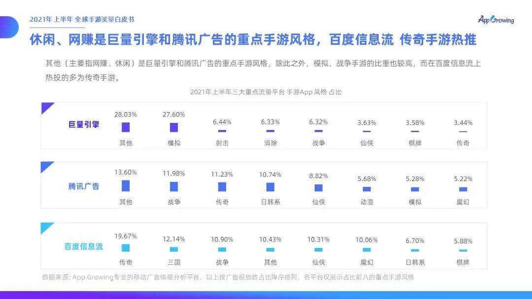 具體的手游風(fēng)格,巨量引擎、騰訊廣告上的熱頭手游多集中在休閑&網(wǎng)賺風(fēng)格,百度信息流上則是傳奇手游投放力度較大。除此之外,戰爭手游在三大平臺上也投放較強勢。