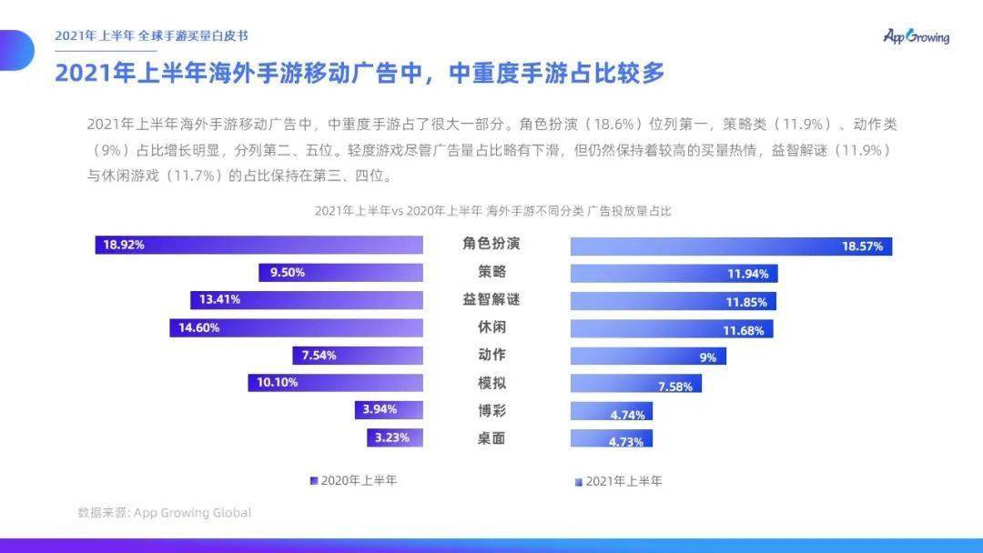 2021年上半年海外手游移動(dòng)廣告中,中重度手游占了很大一部分,角色扮演位列第一,策略類(lèi)、動(dòng)作類(lèi)占比增長(cháng)明顯。